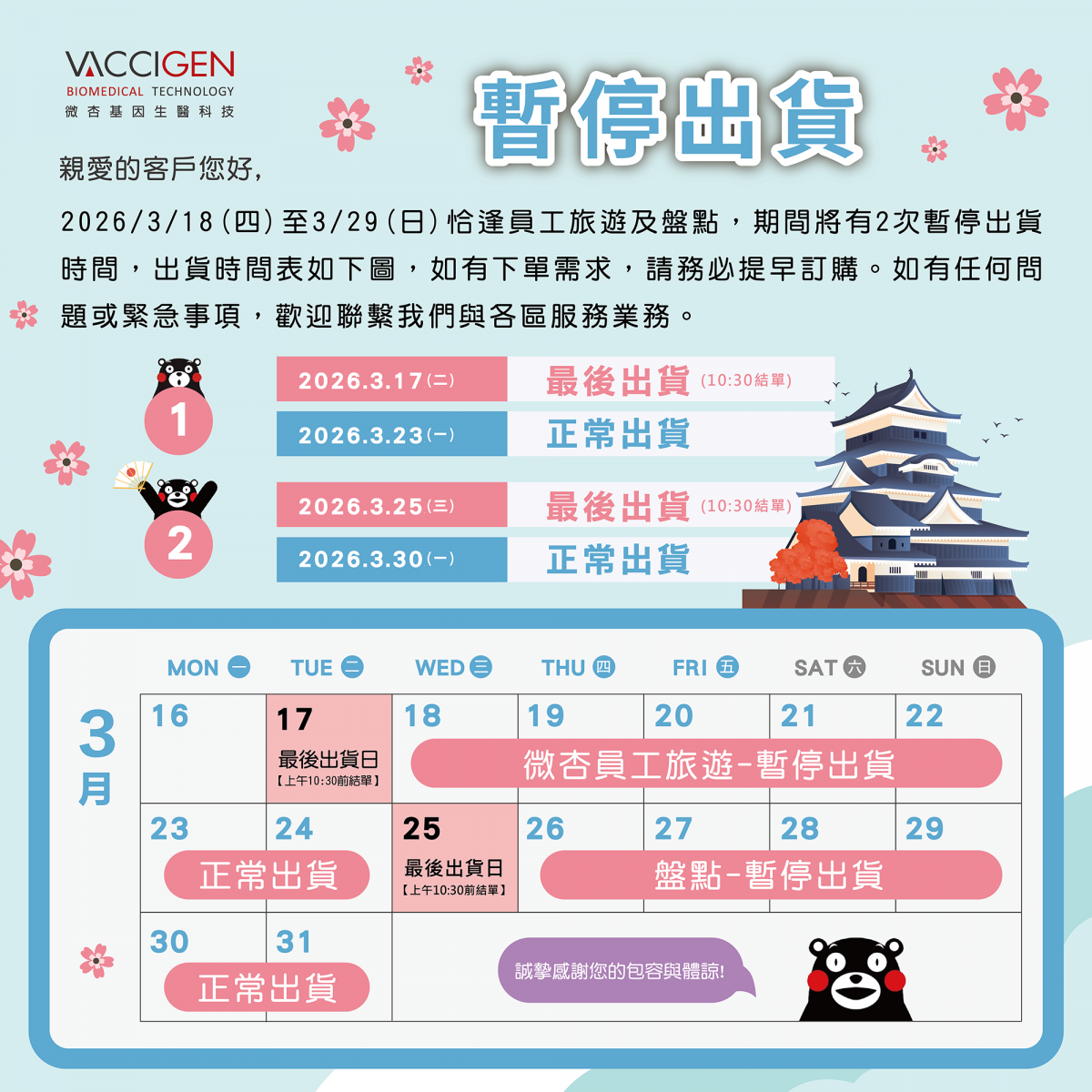 2026/3/18(四)至3/29(日)恰逢員工旅遊及盤點,