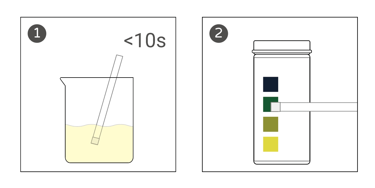 (1) 取一乾淨容器盛裝待測油品,從試劑包中取出測試條,將試紙測試區塊浸入油中直至反應區完全變色即可(勿超過10秒),並立即取出,勿將試紙條浸泡在待測液中。