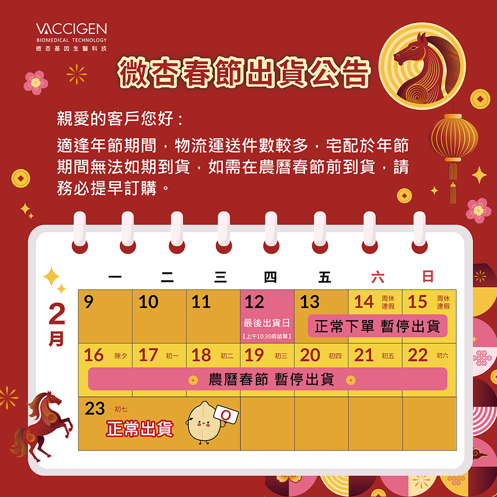 感謝您對微杏基因生醫科技有限公司的支持與愛護,【2026年2/12日,為本公司最後出貨日】,想要在春節前收到商品的朋友務必於2/12上午10:30前完成下單。