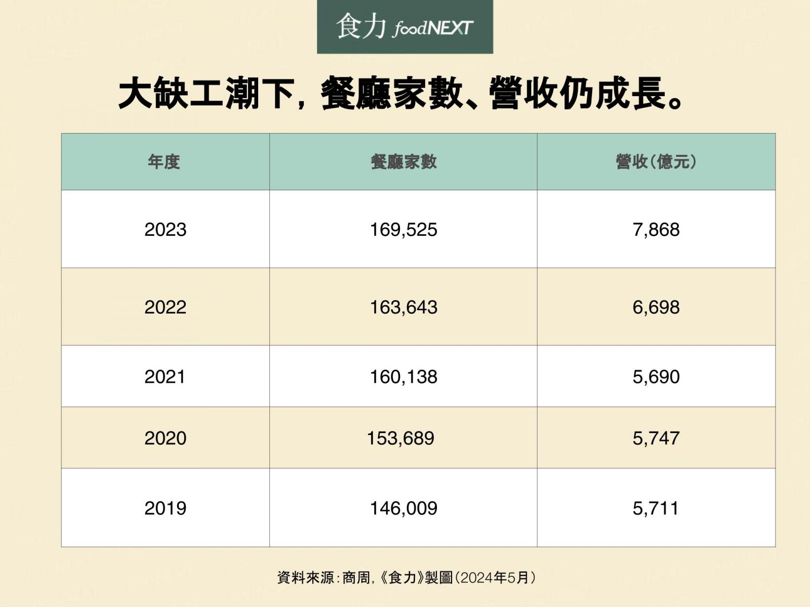 先看一組數據:財政部統計顯示,截至2023年底,餐飲業家數為16.9萬家,比2022年底增加近6千家;總營收為7,868億元,年增率高達17.5%。